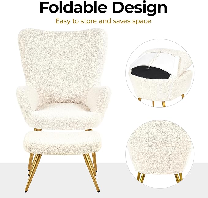 - Sturdy Construction & Folding Backrest: This armchair and ottoman set is built of long-wearing polyester boucle fabric, solid metal legs, and high-density foam filling. When not in use, the high back can be folded down to protect the chair from dust and facilitate storage