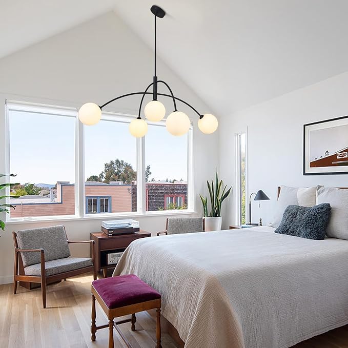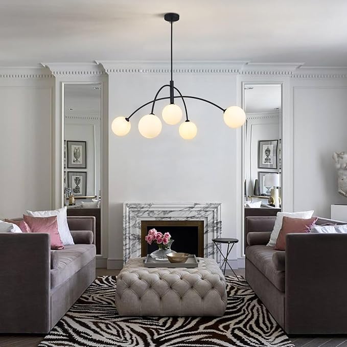 - 1.[Modern Chandelier]: The dining room chandelier adopts 5 spherical glass, and the lamp arms extend outward from the central column, so that the light source spreads out from the center. With its elegant appearance and strong light-transmitting glass shade, the black chandelier emits a dazzling and luxurious light.