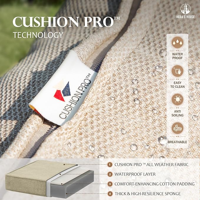 - 【ALL WEATHER USE】Special CUSHION PRO technology applied on the fabric of cushions. It makes the dirts be easily wiped down. Water-proof and oil-proof perfectly for all seasons use.