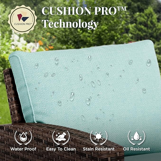 - 【CUSHIONPRO TECH】Patent CushionPro outdoor fabric with water-repellent, soil-release, and stain-resistant properties, making it easy to clean with just a sponge and cleaning spray. 4 thick soft cushion filled with 28D density phenol-free sponge with high resilience for comfortable sitting. Wide and deep seats reduce the pressure when sitting for a long time, and let you be immersed in a comfortable environment