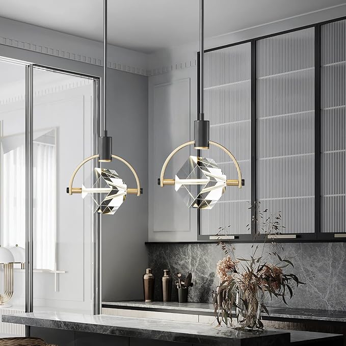 Pendant Ceiling Light Fixture for Kitchen Island, Dimmable Modern Integrated LED Hanging Light, Crystal Pendant Light in Black Gold Finish, Bedroom, Dining Room (1-Lights)