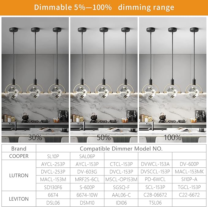 - 【Dimmable Light Fixture】Pendant lights has 5%-100% dimming range, compatible with most household thyristor LED dimmers and operates smoothly without flicker. Suitable for 110~120 volts.Perfect for dining room, reading room, sink or bar, kitchen island, or as a kitchen sink light etc