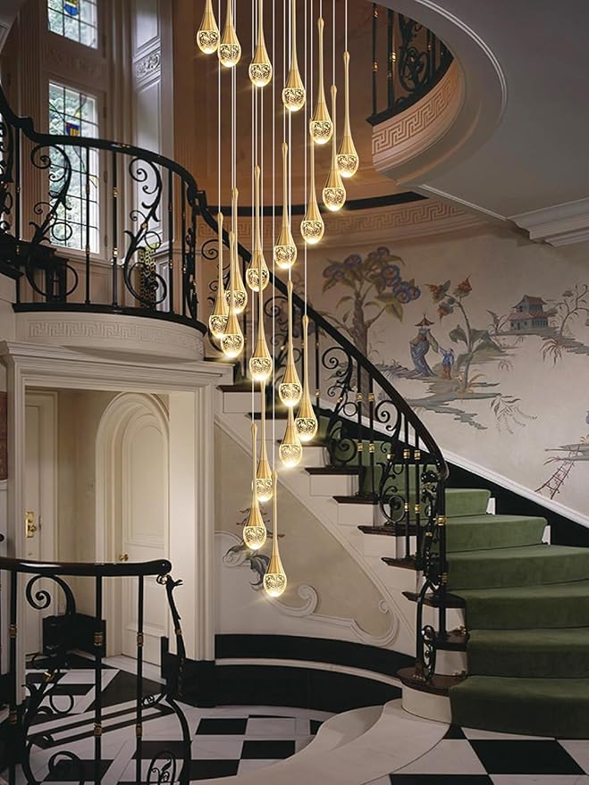 138'' High Ceiling Chandelier for Entryway Gold Raindrop Crystal Chandeliers for Living Room Foyer Staircase Flush Mount Sloping Ceiling Pendant Light Fixture LED Dimming 2700k-6000k