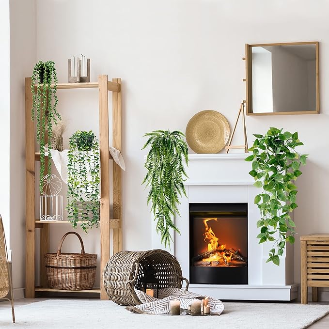 Sggvecsy Fake Hanging Plants 4 Pack Artificial Hanging Plants Fake Potted Greenery Faux Eucalyptus Vine String of Pearls Boston Fern Ivy Vine Leaves for Home Indoor Outdoor Shelf Wall Garden Decor