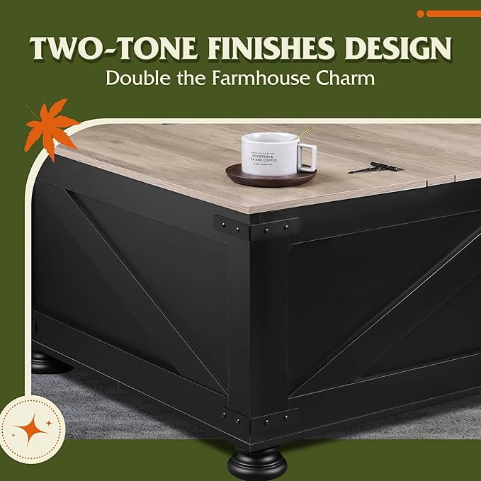 - Spacious Hidden Storage: Measuring 31.5" x 31.5" x 17.4", this farmhouse coffee table offers ample storage. The lift-top reveals large compartments for pillows, blankets, board games, and toys, keeping your living space organized and clutter-free.