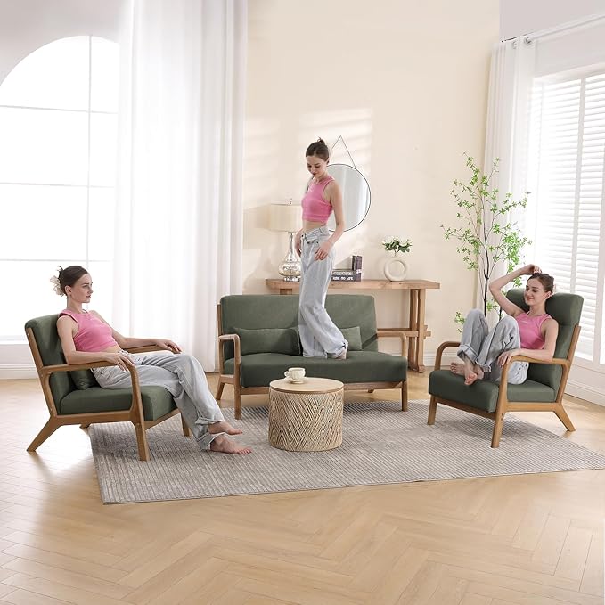 INZOY Mid Century Modern Accent Chair with Wood Frame, Upholstered Living Room Chairs with Waist Cushion, Reading Armchair for Bedroom Sunroom (Green)