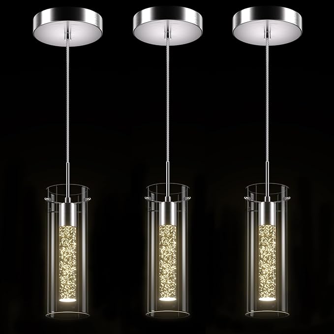 Pendant Ceiling Light Fixture - LED Crystal Pendant Lights for Kitchen Island, Modern Island Light with Bubble Glass - 3 Pack