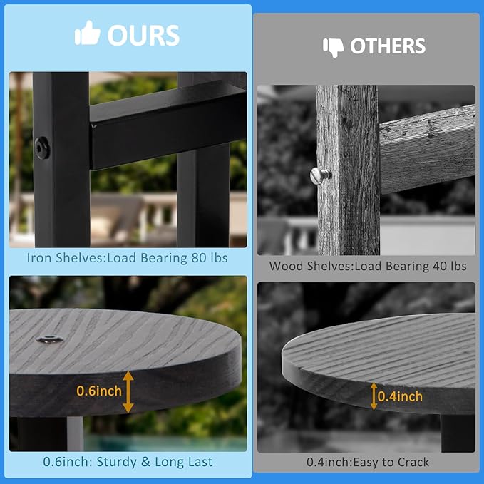 - IRON SHELF SUPPORT UP TO 80 LBS: Made of sturdy metal, this corner plant stand can hold up to 80 lbs ensuring long-lasting use. The sleek and shiny boards are natural, durable, and also easy to maintain. The round base is more stable than triangular and square bases. The stand's sturdy construction helps prevent accidental tipping, ensuring the safety of your beloved plants.