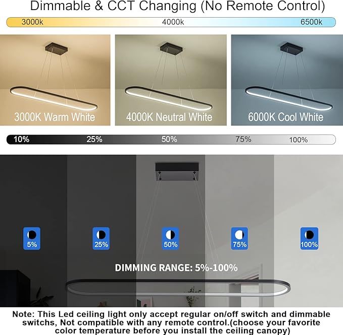 - IMPORTANT NOTED:PLEASE CHOOSE YOUR FAVORITE COLOR TEMPERATURE BEFORE YOU INSTALL THE CEILING CANOPY(NO REMOTE CONTROL). This led chandelier only accepts regular on/off switches and dimmable switches, Not compatible with any remote control.