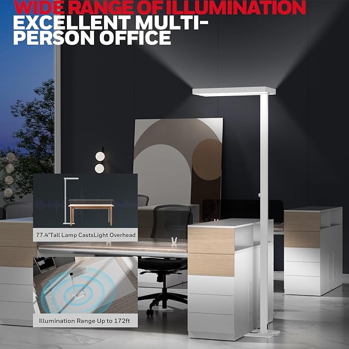 - 【Super-Bright 100W 10400LM Office Floor Lamp 】Honeywell 77.4'' standing lamp with 24" x 11.3" large rectangular panel that emits light up and down, the floor lamp utilizes ceiling diffuse reflection and micro-prism diffusers to evenly spread the light throughout the entire space, with an illumination range of up to 172 square feet.Perfect natural daylight office floor lamp for living room, study room, offices, piano room,workplace.