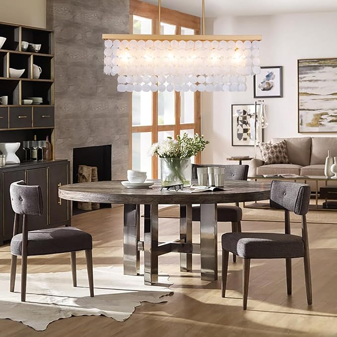 - Coastal Style Capiz Chandelier: Crafted from metal, this rectangle chandelier is adorned with strands of circular capiz shells in a semi-transparent, pearl-like hue for a breezy and coastal look