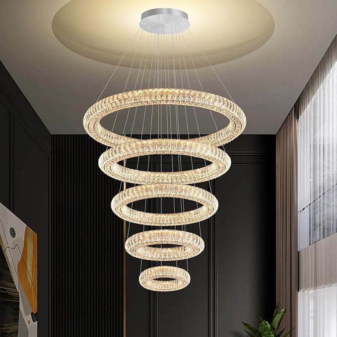 - ✨【 Luxury Crystal Ring Chandelier 5 rings】: (D8"+D15.7"+D23.6"+D31.5"+D39.4"); Cable length Max 138"/350cm (Adjustable). The LED pendant lighting is perfect for installing over the dining room table, kitchen island, and restaurants, and also suits the living room, bedroom, hallway, hotel, staircase, foyer, office...