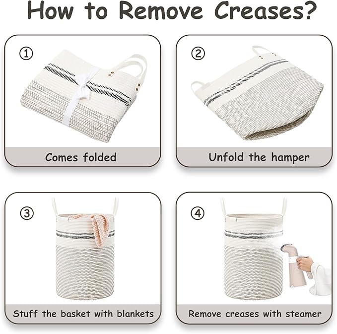- ❤【WAY TO RESTORE ELEGANT SHAPE】 Our collapsible baskets are folded during shipping. Please fill the hamper with clothes or blankets for a period of time. If you want to remove creases from the surface of the tall basket, you can use a steamer.