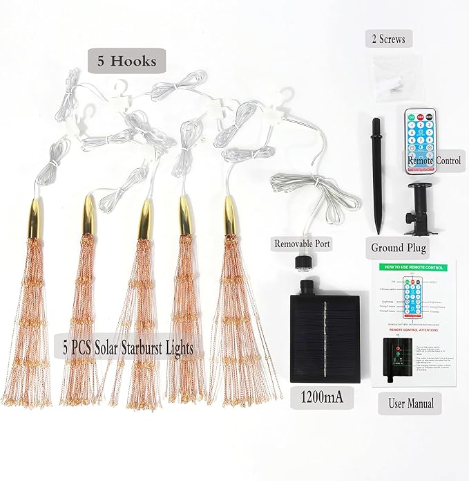 - 【Upgrade 200 BULBS +MORE BRIGHTNESS】5pcs solar firework lights are connected to each other, LED starburst lights have 5 LED bulbs on each copper wire, you can get the string light of 1000 LED bulbs. Copper wire can be bent into your favorite shape. The hanging lights has flashing modes (normally lit/flashing). Better decorate your environment.