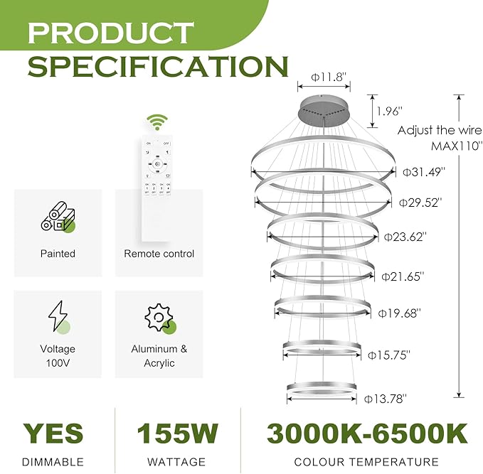 - MULTIPLE SHAPES LED CHANDELIERS: This foyer led chandelier can freely adjust the height of the chandelier lighting fixtures according to the needs of the scene, and the modern high ceiling chandelier can be adjusted from 1 inch to 110 inches with ultra-long cables. 7 ring diameter: 13.78"+15.7"+19.7"+21.65"+23.7"+29.5"+31.5". The circular design is easy to adjust and clean (with instructions included in the packaging).