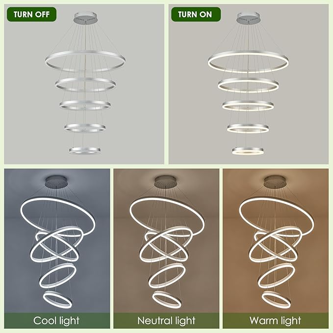 - MODERN LED CHANDELIER: This 5-ring led chandelier silver is based on an energy-saving concept and is made of high-quality aluminum, metal, and acrylic materials. The circular ring of the LED chandelier cleverly combines with the elegant design, making it perfect for your home.