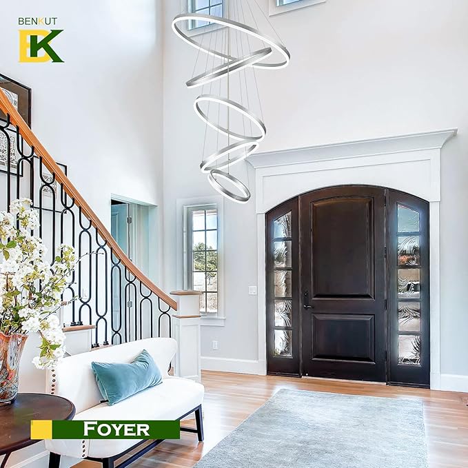 - MULTIPLE SHAPES LED CHANDELIERS: This dining room led chandeliers can freely adjust the height of the chandelier lighting fixtures according to the needs of the scene, and the modern high ceiling chandelier can be adjusted from 1 inch to 91 inches with ultra-long cables. 5 ring diameter: 11.8"+15.7"+19.7"+23.6"+31.5". The circular design is easy to adjust and clean (with instructions included in the packaging).
