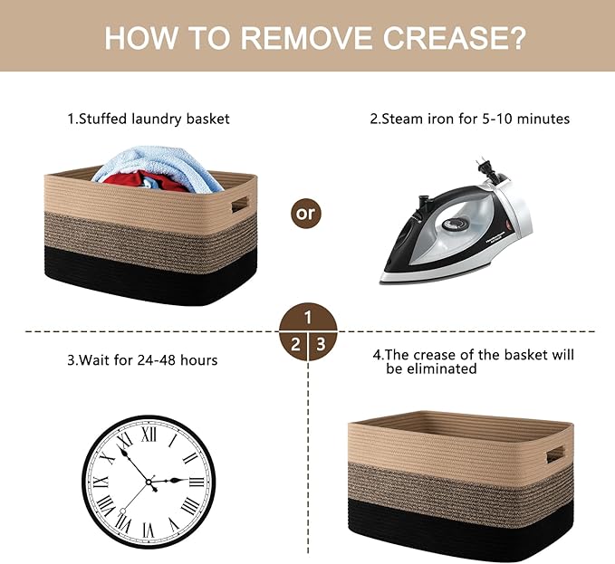 - Washable Large Basket: This large basket can be washed by hand or machine with gentle detergent. If machine washed, please put them into a laundry bag. NOTE: These cotton rope baskets are folded when shipping, but it will turn back to its elegant shape quickly if you fill it with some towels or clothing, and iron is great idea to remove the creases