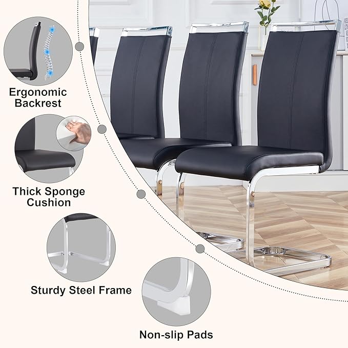 - High-Quality Construction:The 63" rectangular dining table is crafted from durable MDF and high-strength tempered glass; the surface is easy to clean;the modern PU dining chairs feature C-shaped chrome-plated legs,offering enhanced durability