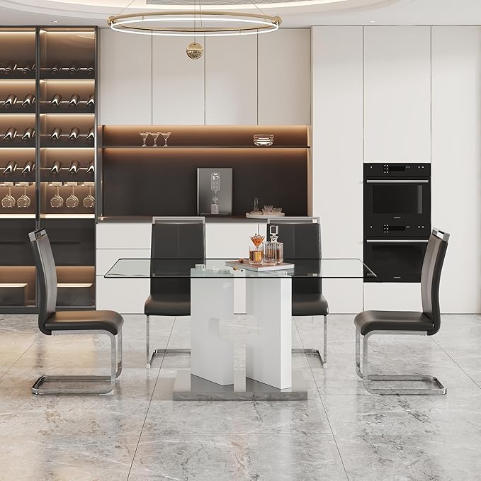 - Complete Dining Set for 4:This glass dining set includes a 63" x 35.4" x 30" dining table and four high-quality PU leather chairs;the table has a weight capacity of 500lbs,while each chair supports up to 250lbs, providing reliable support for daily use