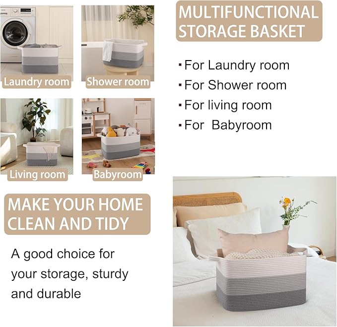 - Washable Basket: This basket can be washed by hand or machine with gentle detergent. If machine washed, please put them into a laundry bag. NOTE: These cotton rope baskets are folded when shipping, but it will turn back to its elegant shape quickly if you fill it with some towels or clothing, and iron is great idea to remove the creases