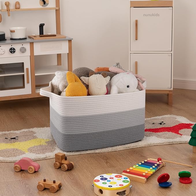 OIAHOMY Cotton Rope Basket, Rectangle Woven Baskets for Storage, Nursery Blanket Storage Living Room, Toy Basket With Handle-17.7”x13.8”x11”-Gradient Grey