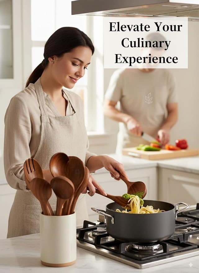 100% Natural Teak Wood Wooden Utensil Set – Non-Stick & Heat Resistant – 8 Pcs Durable Kitchen Spoons for Cooking, Eco-Friendly & Comfortable Grip