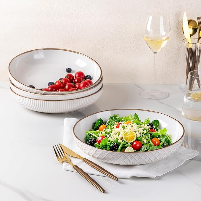 GBHOME 9.5'' Large Pasta Bowls, 42 Ounce Stoneware Salad Bowls for Kitchen, Ceramic Serving Bowls With Textured Pattern for Pasta,Fruit, Stews,Noodle, House-warming Gift,Set of 4-Off White