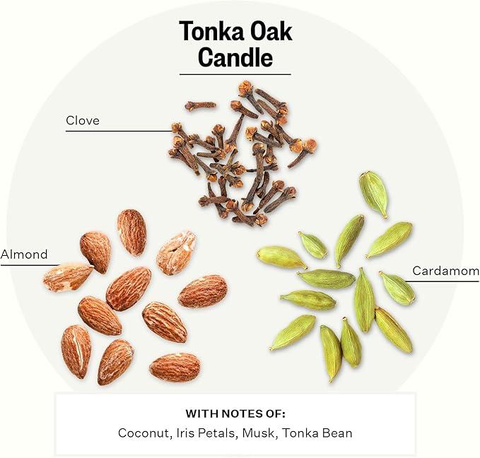 - The Fragrance: Tonka Oak combines sweet almond, warm cardamom, and spicy clove with creamy coconut, iris petals, musk, and tonka bean for a smooth and well-rounded fragrance.