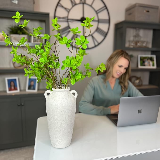 12 Inch Tall White Ceramic Vase, with 5 Branches of 25 Inch Faux Artificial Vibrant Greenery Stems Set, Textured Minimalist Jug, Fake Stem Plants, Decorative Farmhouse, Console Table Centerpiece Decor