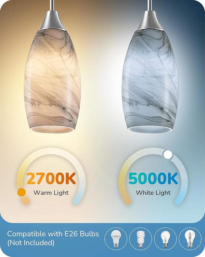 - 【Hand-Blown Art Glass】 Crafted from unique hand-blown art glass, each piece of glass has different color and pattern. This modern pendant light boasts distinctive grey marbling and a brushed nickel light pole, complemented by a thick glass shade with smooth edges, casting an elegant, soft glow for a cozy atmosphere