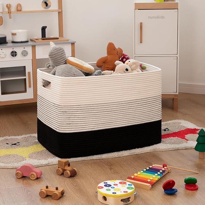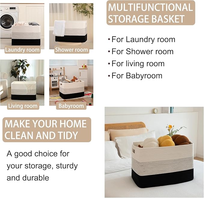 OIAHOMY 108L Large Cotton Rope Basket, Rectangle Woven Baskets for Storage, Nursery Blanket Storage Living Room, Toy Basket With Handle-25”x16”x16”-Gradient Black