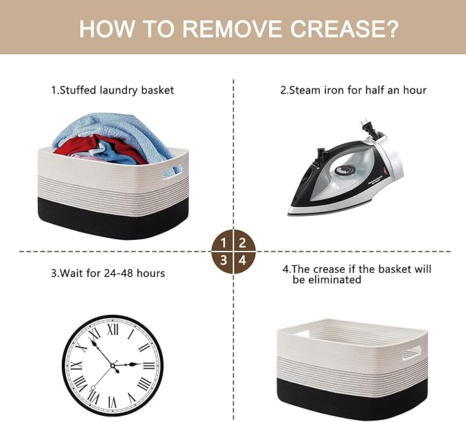 - Washable Large Basket: This large basket can be washed by hand or machine with gentle detergent. If machine washed, please put them into a laundry bag. NOTE: These cotton rope baskets are folded when shipping, but it will turn back to its elegant shape quickly if you fill it with some towels or clothing, and iron is great idea to remove the creases