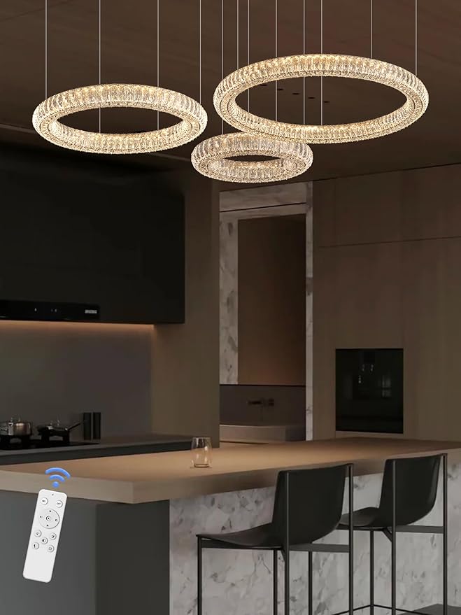 - Crystal Ring Chandelier 3 rings (32"+24"+16"); Cable length can be adjustable. The LED pendant lighting is perfect for installing over the dining room table, kitchen island, and restaurants, and also suits the living room, bedroom, hallway, hotel, staircase, foyer, office...