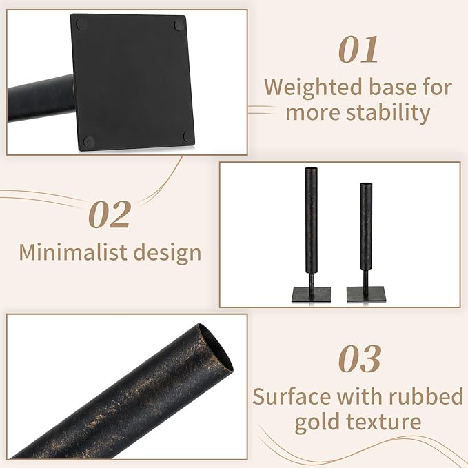 - BOTTOM-WEIGHTED MORE STABILITY - The base of 2 piece black vases can be rotated and disassembled for easy storage. The black vases for centerpieces are made of high quality metal with a smooth black finish with brushed gold texture. The tall skinny vase has a durable structure and gives it a long service life. Suitable for families with children and pets, not easily damaged.