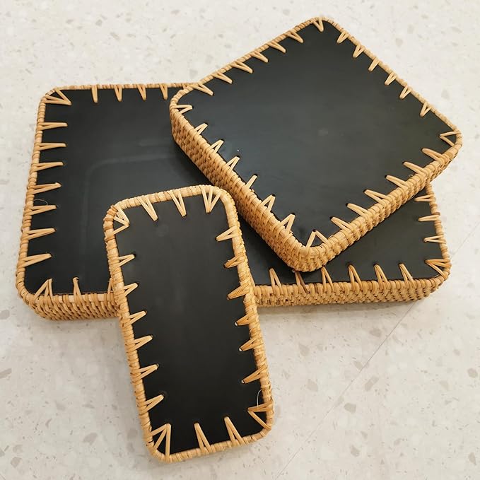 - It is set of 3 rattan mixed Mother of pearl inlay technology handcrafted traies; Dimensions: Large: L365mm * W230mm * H60mm / 14.4inches(L) * 9inches(W)*2.4inches(H); Medium: L210mm * W210mm * H45mm / 8.3inches(L) * 8.3inches(W)*1.8inches(H);Small: L110mm * W210mm * H40mm / 4.3inches(L) * 8.3inches(W)*1.7inches(H), stackable for easy to storage.