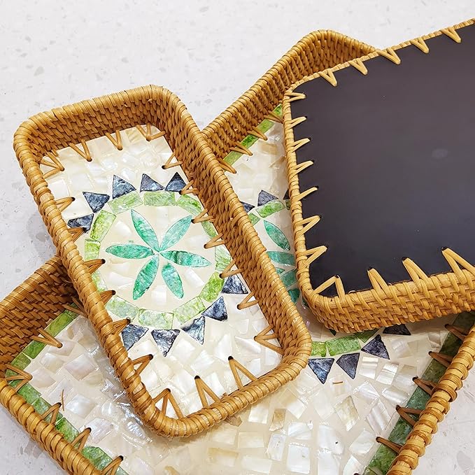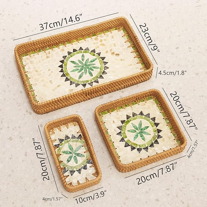 - It is set of 3 rattan mixed Mother of pearl inlay technology handcrafted traies; Dimensions: Large: L365mm * W230mm * H60mm / 14.4inches(L) * 9inches(W)*2.4inches(H); Medium: L210mm * W210mm * H45mm / 8.3inches(L) * 8.3inches(W)*1.8inches(H);Small: L110mm * W210mm * H40mm / 4.3inches(L) * 8.3inches(W)*1.7inches(H), stackable for easy to storage.