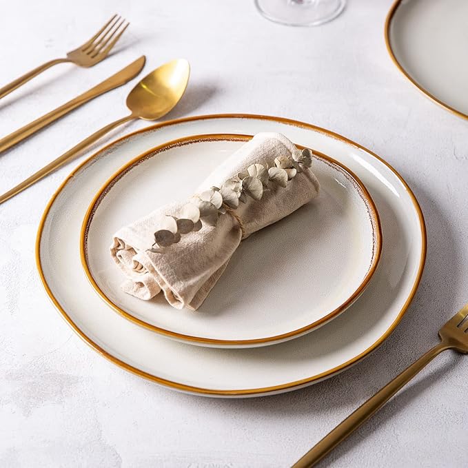 - GOOD SHAPE AND MULTI-PURPOSE:: the flat dinner plates set creates a Rustic and minimalist table setting.The shape is great as it makes. they are easier to handle and hold and they stack really well without taking up much space,stack and nestle nicely in your cupboard or shelves.Our Dinnerware set is microwave,dishwasher and freezer safe,Perfect for every day use, indoors or out; ideal for any kitchen let your food look even more delicious, and make you happy every day.