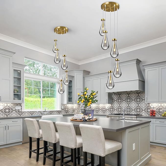 Raindrop Pendant Lights Kitchen Island Teardrop Gold Hanging Light Fixtures Clear Solid Glass Pendant Light Modern Chandeliers for Dining Room Porch Corridor Living Room(5-Light)