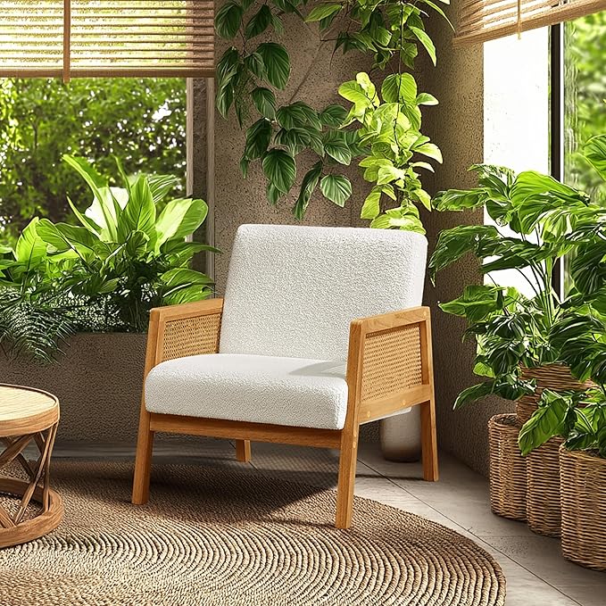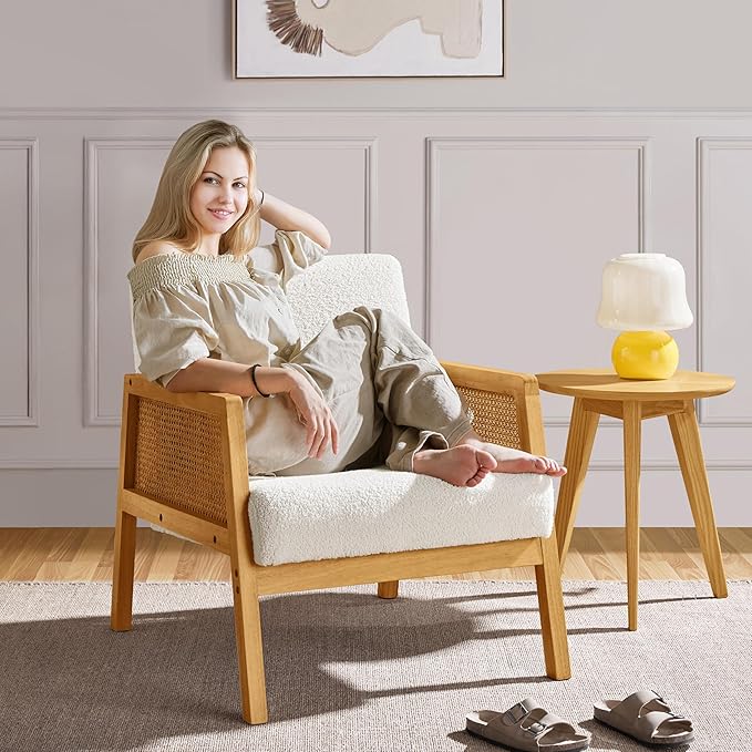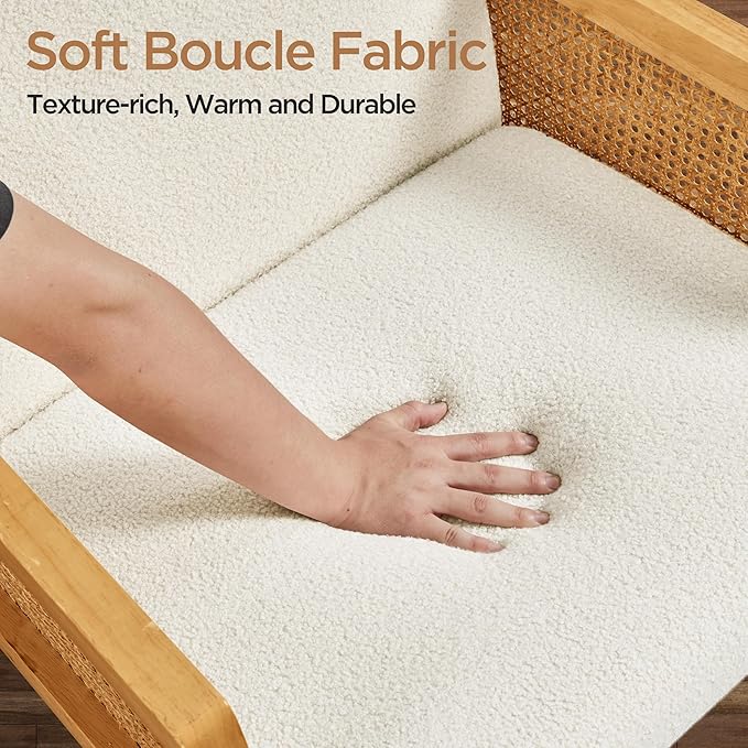 Yaheetech Boucle Fabric Accent Chair, Vintage Rattan Vanity Chair with Wood Armrest and Legs for Living Room Bedroom Makeup Room, Ivory 1