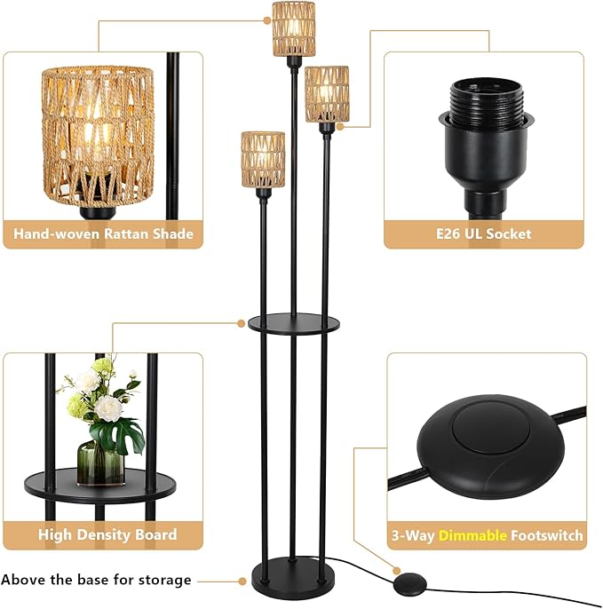 - 【3-Lights Rattan Floor Lamp】This boho floor lamp consists of three hand-woven natural rattan lampshades and acrylic shelf. Combination of natural elements makes this farmhouse floor lamp ideal for bohemian, rustic, vintage and industrial home styles. Three light poles are fixed to the heavy metal base to make this standing lamp stable enough. The weighted base of the shelf floor lamp is designed to prevent tipping and keep you and your family safe at home.