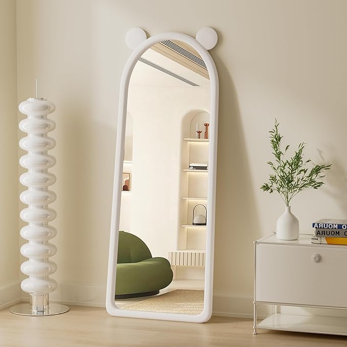 Full Length Mirror, Arched Wavy Floor Mirror with Stand, 63"x24" Wall Mirror Full Length, Freestanding Mirrors Hanging or Leaning, Large Body Mirrors with Flannel Frame for Bedroom (Ear White)