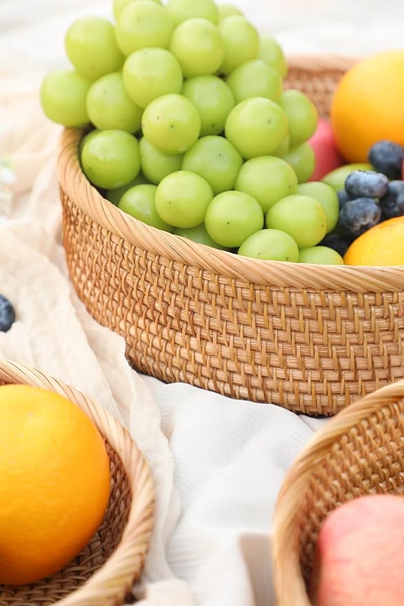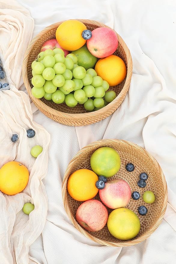 HITOMEN Handmade Rattan Bread Baskets Round Wicker Fruit Serving Storage Bowls, Natural Woven Decorative Kitchen Counter Organizing (Honey Brown) L-10.3"