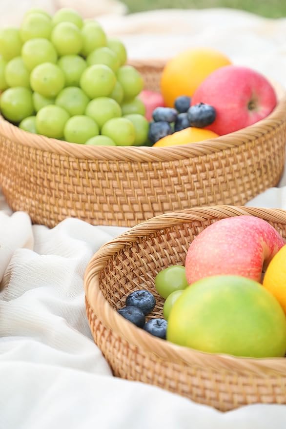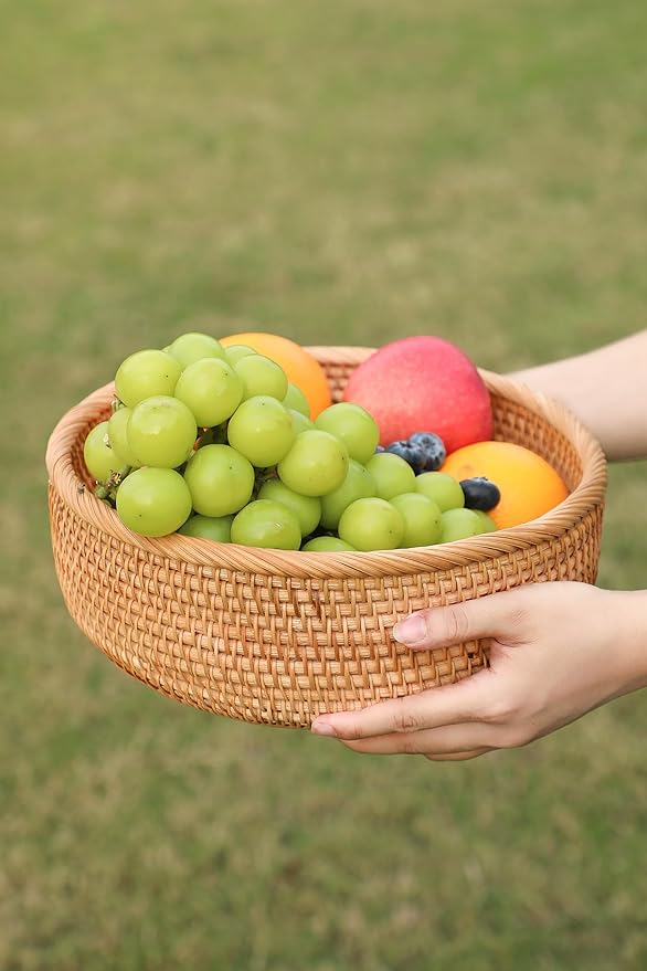 HITOMEN Handmade Rattan Bread Baskets Round Wicker Fruit Serving Storage Bowls, Natural Woven Decorative Kitchen Counter Organizing (Honey Brown) M-9.1"