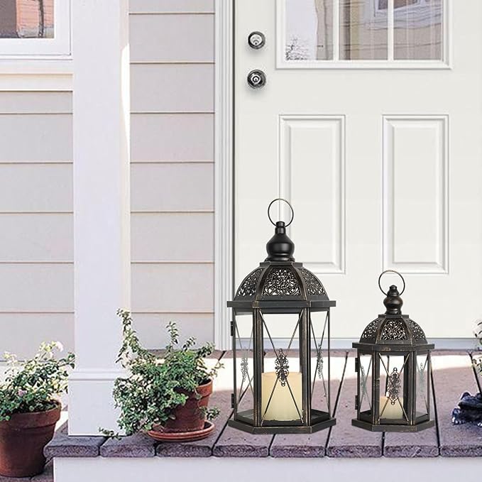 - LANTERNS DECORATIVE INDOOR&OUTDOOR - This charming lantern will suit both indoor & outdoor decor. You can decorate your front porch with this lantern, whether it looks great on a tabletop or on the porch step. Or place it on your doorway path to illuminate your path and entrance. Lanterns can be displayed indoors or outdoors under a covered area. Ideal as an indoor decoration too, use it to decorate your shelf, fireplace, windowsill, living room, or dinner party to add a warm touch to your home.