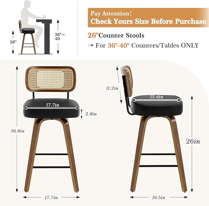 - Counter Height (26") for 36-40" counters : MEASURE YOUR KITCHEN COUNTER TO ENSURE THE BEST FIT BEFORE PURCHASE.- Two Backrest Styles: Our counter height stools offer two ergonomic options for the backrest. Opt for the meticulously braided PE rattan backrest, made from premium plastic material that resembles real rattan but with a smoother texture. The second option features an upholstered backrest with a wooden board and PU upholstery, showcasing a unique wood grain appearance