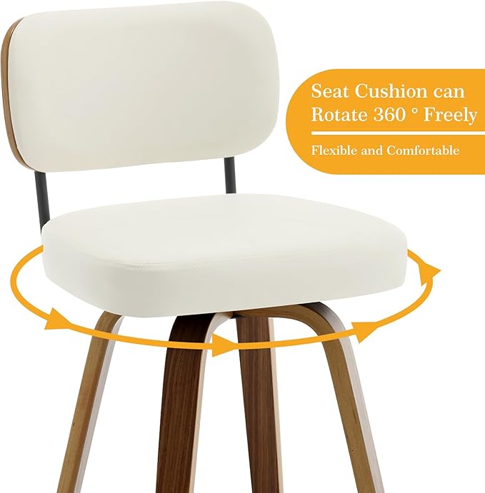 - 【Comfortable Seat & Walnut Bentwood Frame】The 26" swivel bar stools boast a clear wood grain appearance and cozy upholstery smooth touch. The natural walnut wood veneer covers the surface of the legs, showcasing a stunning and natural grain pattern that can withstand daily wear and tear. The seat is filled with high-density sponge, which not only allows for a gentle and comfortable sink-in sensation but remains resilient and durable over time