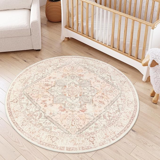 LIVEBOX Washable Peachy Pink Rug 5ft - Medallion Vintage Circle Rugs for Bedroom, Low-Pile Tribal Print Carpet for Nursery, Non-Slid Distress Floral Circular Rug for Living Room Kid's Room Entryway