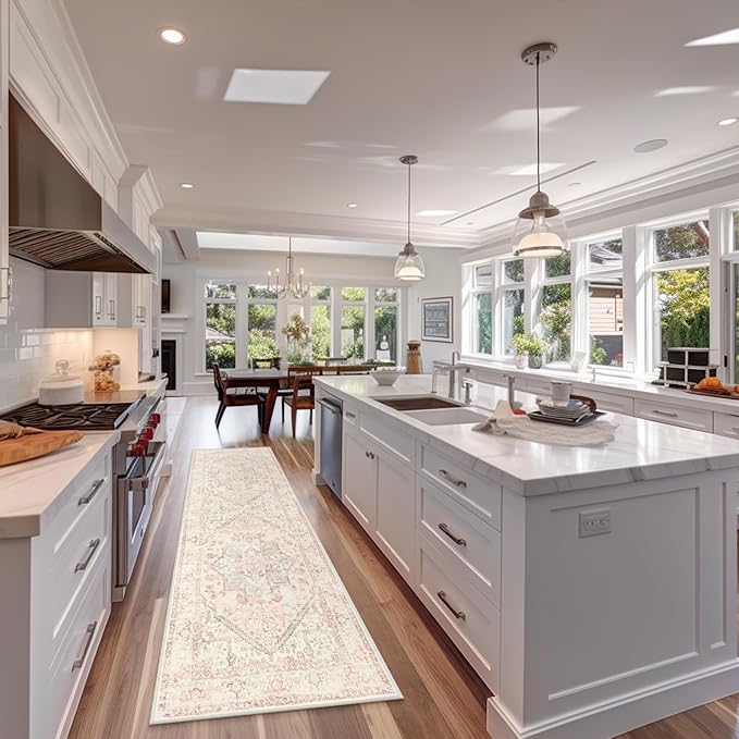 - [Foldable Soft Oriental Rug]:Washable 2.5x8 rug folds without leaving creases for easy seasonal storage.Chic boho and retro kitchen runner rug featuring gorgeous patterns printed on soft & cozy short pile for a velvety touch. Vintage pink exudes tranquility and inspires quiet meditation.