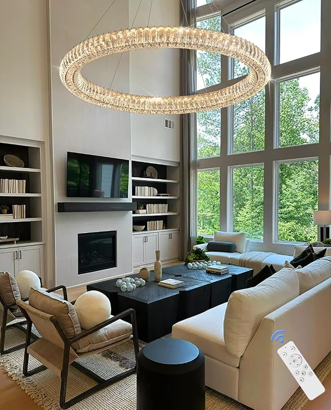- ✨【Dimmable LED Crystal Ring Chandelier】: 54W.4860Lumens. Including built-in LED light source,and remote control dimmable 3000-6000K color temperature, 5%-100% brightness adjustment,the chandeliers have their own dimmers, which can adjust different light colors according to mood. The AC85-256V voltage can be anywhere.